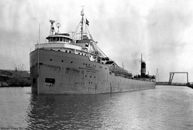 CEDARVILLE Other names : built as A.F. HARVEY, last name in 1957 Official no. : 226492 Type at loss : propeller, steel, self-unloading bulk freighter Build info : 1927, Great Lakes Engineering, River Rouge, MI hull #255 Specs : 588x60x32 8575 g 6229n Date of loss : 1965, May 7 Place of loss : 3 mi E of Mackinac Bridge, Straits Lake : Huron Type of loss : collision Loss of life : 10 Carrying : limestone Detail : Moving at speed in fog, she collided with the Norwegian freighter TOPDALSFJORD about 9:50 am and sank quickly. German motor vessel WEISSENBURG picked up the survivors. Wreck location: 3.1 mi, 120 deg from S pier of Mackinac Bridge. She was later found to be at fault in the collision. She is a popular dive target. Built as a bulk freighter, she was converted to a self-unloader at Defoe Shipbuilding, 1957 Sources: eas,glp,is(3-65),slh,sol,ns5,lhdc,ssm,mpl,hcgl |
