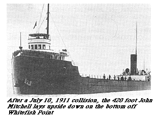 A steel freighter many divers overlook, she is in 150 feet of water, but is upside down. The Mitchell collided in the dense fog with the Mack on July 10,1911 and sank quickly. She is located about 3 miles west of Whitefish Point. The Mitchell is a exciting wreck to dive with her intact engine room hanging upside down. Please remember there is only one way in & one way out of her.