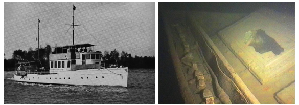 A small steel, hulled yacht that sank in a storm September 19, 1929. She lies 185 in feet of water 10 miles east of Kenosha.
