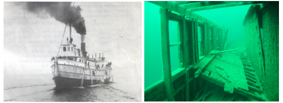 Lakeland- She rests at the southern most tip of Door County. The Lakeland is a 280 foot freight and passenger steamer built in 1887. On December 3, 1924, she was down bound for Chicago when she took on water and foundered in heavy seas and sank. She lies in 220 feet of water upright and very intact. The Lakeland carried a cargo of cars and packaged goods including Canadian whiskey.